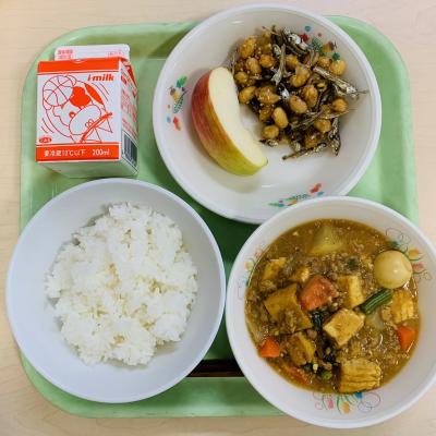 今日の給食は「ごはん 牛乳 大豆と小魚のごまからめ 生揚げと大根のカレー煮 りんご」です。