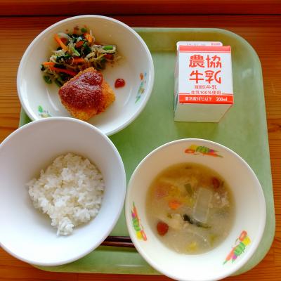 今日の献立は、「ごはん・牛乳・堅豆腐カツ・ごまだれ・小松菜としらすの和え物・白山汁」です。今日は白山市の特産物を使った「白山市献立」です。白峰の堅豆腐、美川でとれるしらす、小松菜や木滑なめこも使いました。