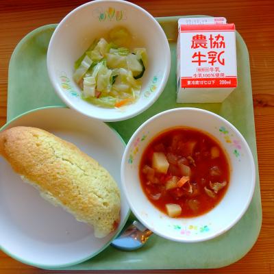 今日の献立は、「メロンパン・牛乳・ベーコンサラダ・ポークビーンズ」です。メロンパンは、コッペパンの上に