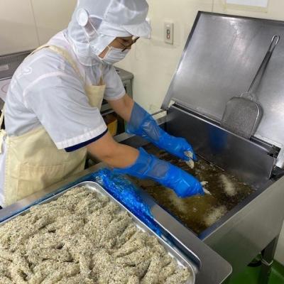 ふっくらと柔らかい身のめぎすは、給食室で青のりをまぜたパン粉を丁寧につけて作ります。