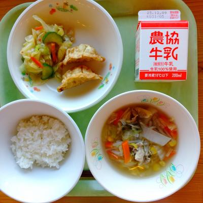 今日の献立は、「ごはん・牛乳・ギョーザ・野菜のピリ辛・塩ラーメン」です。定番の献立ですが、人気のある献立です。ラーメンはめんをスープにいれてしまうとのびやすいので、めんとスープは別々に出しています。盛り付けるとき、お椀にめんを入れてからスープを注ぎます。