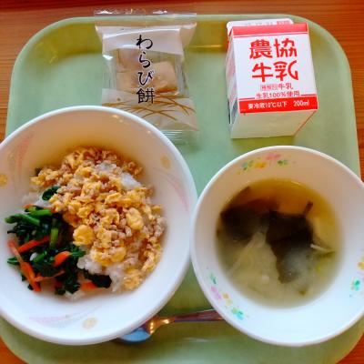 今日の献立は、「食卓が明るくなる三色丼・牛乳・はなちゃんのみそ汁・わらびもち」です。
