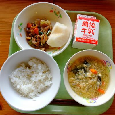 今日の給食は「ごはん・牛乳・ホイコーロー・たまごとわかめのスープ・梨」です。