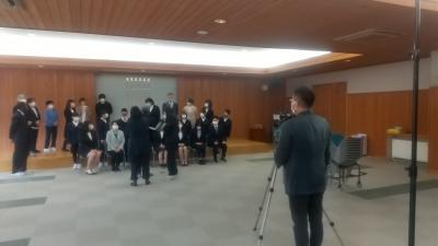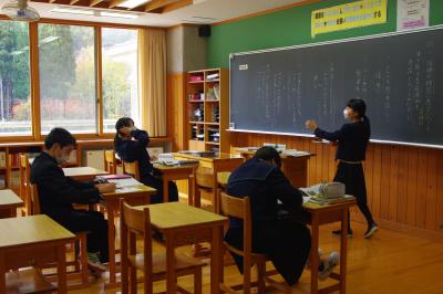 小小・小中連携授業体験を行っています。白峰小学校と白嶺小学校の6年生が一緒に中学校の英語の授業を受けます。はじめに、中学2年生が、小学校と中学校の違いについて英語で説明しています。