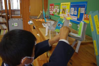 国語 作ったおもちゃの説明文を書くために、実際におもちゃを作っています。ボール紙で馬を作っています。