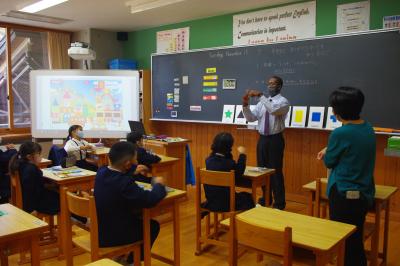 外国語活動 色や形について表現する言葉を、チャールズ先生と楽しみながら学んでいます。