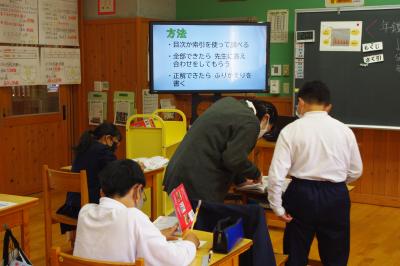 国語 学校司書の先生と共に、年鑑の活用方法について学んでいます。男子100m日本記録や全国の小学校数などの例題に、学校図書館の年鑑を使って調べます。
