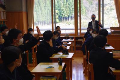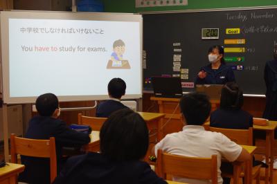 次に、小学生から、宿題の量はどれくらい?給食の量は増える?部活で一番楽しいことは?などの質問が出ています。その後、小学生同士でグループになり中学校の英語授業を体験しています。