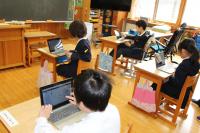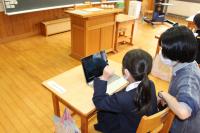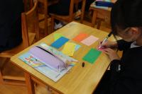 3・4年 外国語活動 3年生と4年生が合同で自己紹介をしました。カードを作っています。