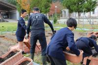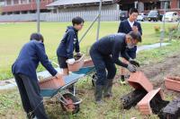 6年 学校の花壇も花の季節が終わり、プランターの片付けをします。土を畑へ運びます。