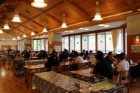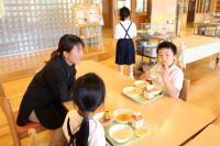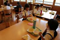 〈給食〉今日のメニューは、ごはん、牛乳、豚キムチ風炒め、コーンかき玉スープ、かぼちゃのカップケーキです。手作りのカップケーキはみんな大好きです。