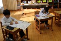 1年 書写 〈「おれ」「まがり」「そり」に気をつけて書こう〉1年生も漢字を上手に書けるようになっています。