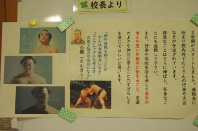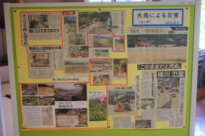 1階調理室前には夏の大雨に関する新聞記事や、本校に関する新聞記事を掲示しています。