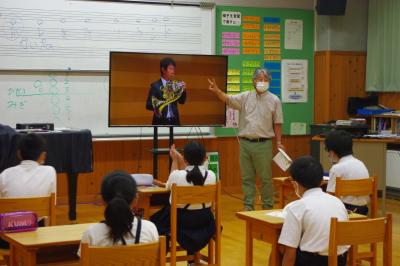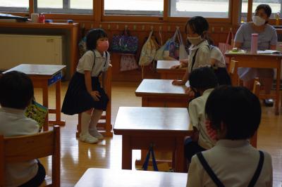 給食の決まりと、よくかんで食べることの大切さについて栄養教諭が話しています。