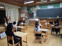小学校1・2年生 朝の会「当番からのお話」 たくさんの子が挙手して、話し手に質問しています。1年生もお話の仕方が上手になってきました。
