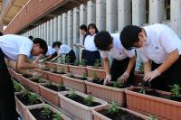 〈小中学校〉「白嶺っ子フラワーガーデン」 中学2年生が設置してくれたプランターに花苗を植えました。中学生はジニアを赤・黄・オレンジ・白の4色、小学生はマリーゴールド(黄)、ブルーサルビア、サルビア(赤)を植えました。