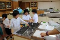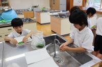 1年 生活科 桜餅をつくるために、校庭の桜の葉を集めてきました。これから洗って塩漬けにします。