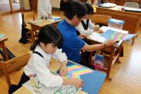 2年 図工「にじのカーテン」 画用紙に色鉛筆やクレパスで色を塗り、細長く切ったものを貼り付けました。きれいな模様になりました。
