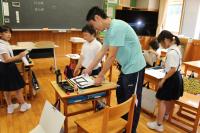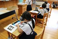 3年 書写 「おれ」 「日」という文字で「折れ」の筆づかいを練習しています。