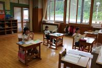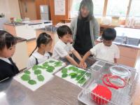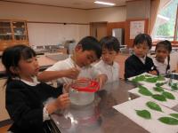 1年 生活科 桜餅づくりのために、桜の葉っぱの塩漬けをします。