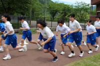 全校 体育 持久走を行いました。ウォーミングアップをおこなったあと、男子は1500m、女子は1000m それぞれのタイムを計測しました。