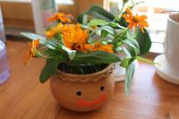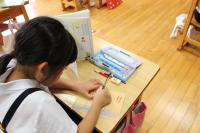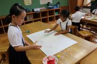 1年 図工 「スタンプぺったん」プリンカップなどのプラスチック容器や段ボール、マヨネーズ容器のキャップなどに絵の具を塗って、スタンプ模様を作りました。