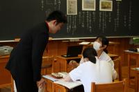 2年 国語「インタビュー」 中学校の先生の話をメモを取りながら聞いた後、質問をしています。