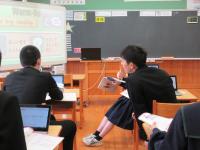 (3年生)英語の授業です。学習者用デジタル教科書を使いながら、音読の練習をしています。