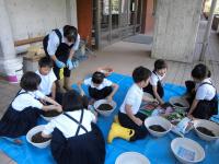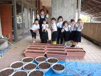 〈小学校〉「人権の花運動の準備」1・2年生がプランターに土を入れる作業をしました。丸い形、四角い形、全部で20個のプランターができました。1・2年生は土をこぼさないように上手に入れていました。2日後に3~6年生が花苗を植える予定です。