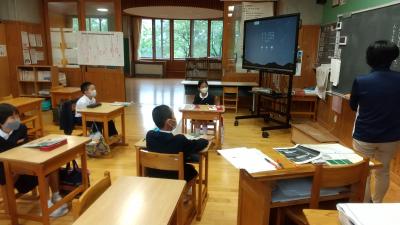 4年生も端末を使います。Teamsで会議を開くため、学校のあちこちに分かれます。