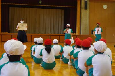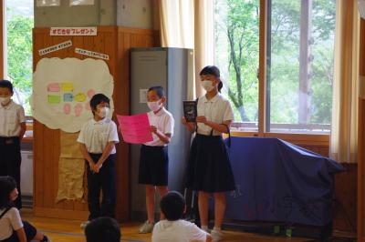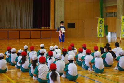 白嶺っ子集会 月1回全校集会を行っています。高学年の児童が会を運営します。今回は、マラソン大会の表彰、養護教諭や栄養教諭からはよくかんで食べることについて、図書委員からは本が紹介されています。
