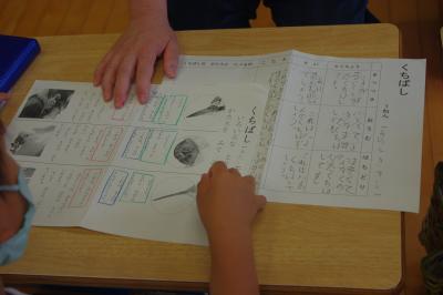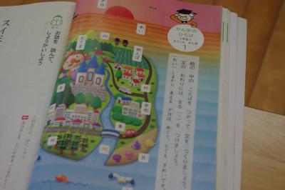 国語 教科書にある絵と言葉を使って一文を作っています。