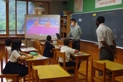 総合的な学習の時間 白山ろく少年自然の家で明日行う5年生の集合学習のリハーサルを行っています。白嶺小学校について他校に紹介します。マラソン記録会や中学生への激励など、学校の特徴を紹介します。