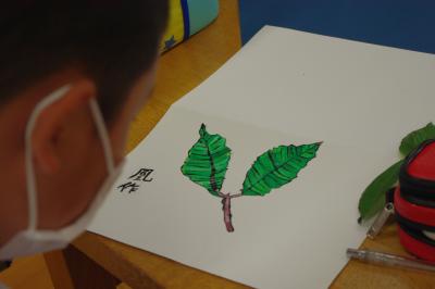美術 葉っぱの絵を仕上げています。