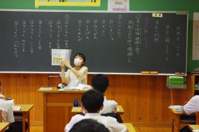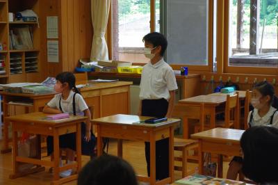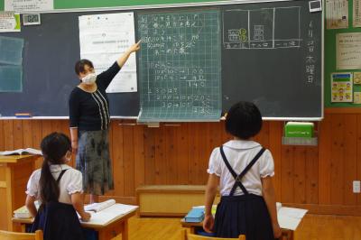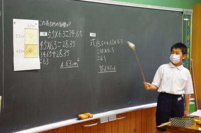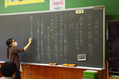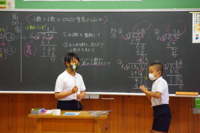 国語では古典の暗唱発表を、算数では小数と小数の割り算をする場合に、どちらも整数にして計算する工夫について児童が発表しています。