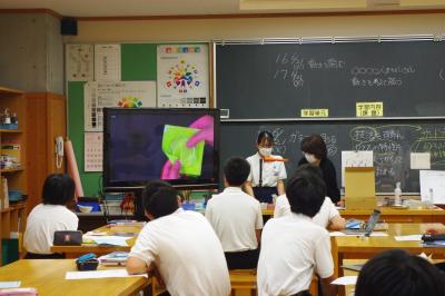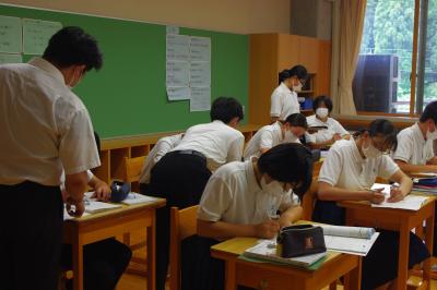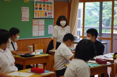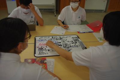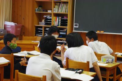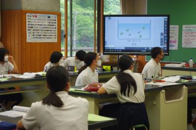 今年度の研究の重点である「まとめふりかえりの充実」に向けて、先生たちが中学校1年国語の授業を参観し、まとめふりかえりの充実のためにどうすればよいかを話し合っています。