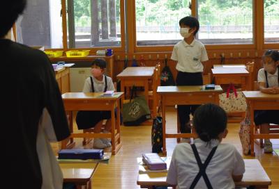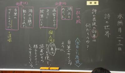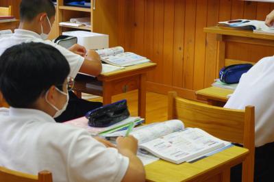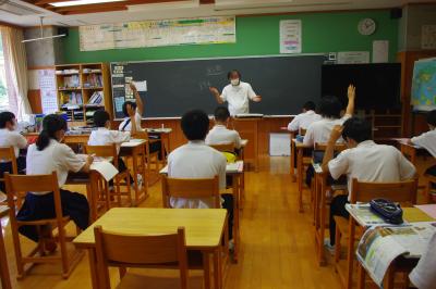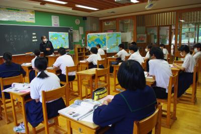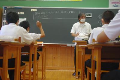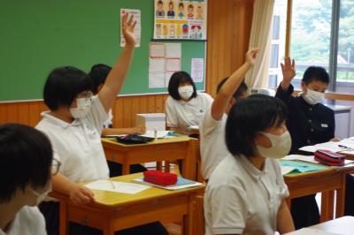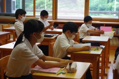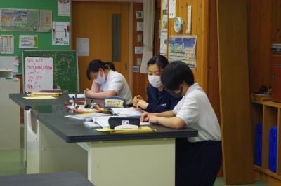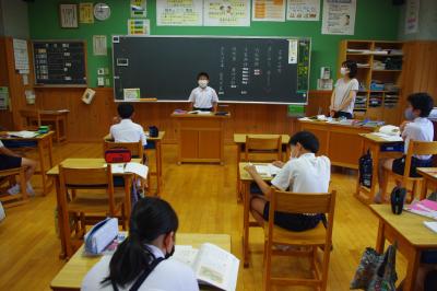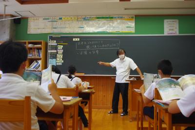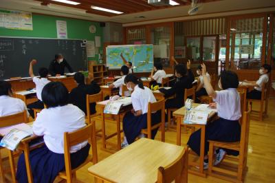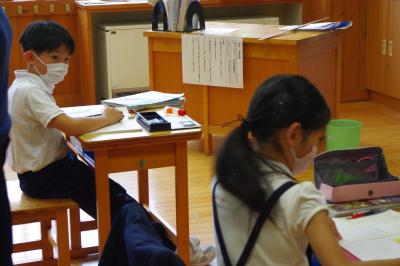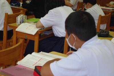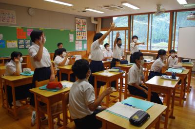 国語では詩の表現の効果について、社会では平安時代にどうやって藤原氏が政治の実権を握ったのかを調べています。挙手発表が多く、意欲的です。