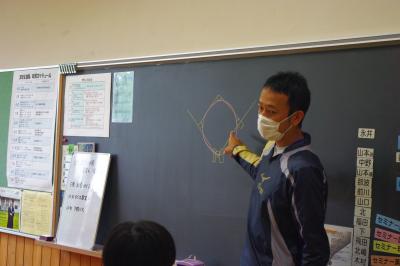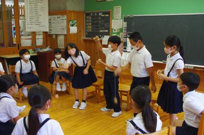 小学校3年生が国語で調べたけん玉などの昔遊びを4年生に紹介しています。