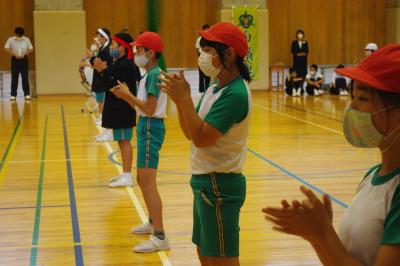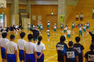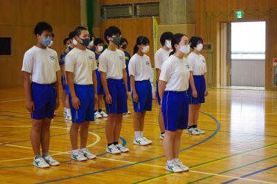 小中学生全員が集まり、中学生の生徒会役員が会を運営する白嶺交流集会が行われています。陸上や空手の優秀成披露や上位大会出場に向けての激励会が行われています。今年の激励会は、選手の入場行進を復活させました。また、6年生を中心に、小学生全員で激励のエールを送っています。