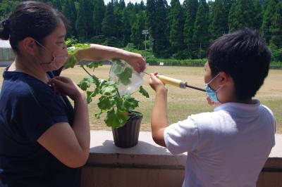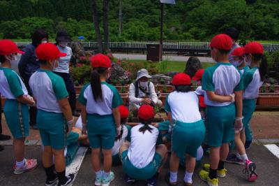 技術 地域のお花の先生指導の下、プランターの花を準備しています。