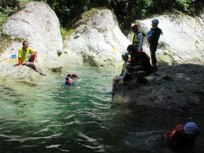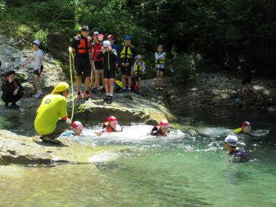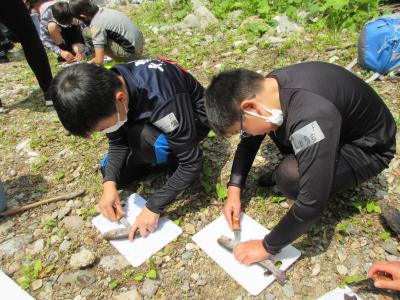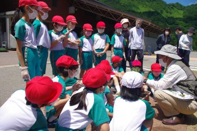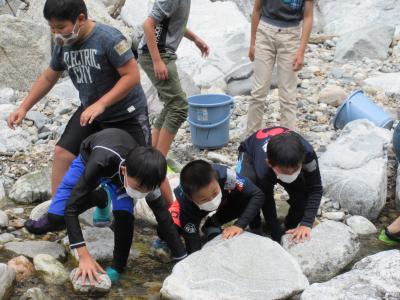 白山手取川ジオパーク学習として、学校からバスで15分程で行ける瀬波川にて自然体験を行っています。生き物を探したり、川を渡ったり、飛び込んだりと、地域の豊かな自然を感じています。毎年行っている、本校ならでは行事です。