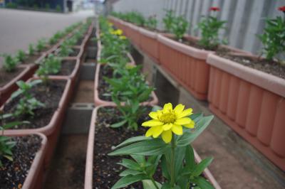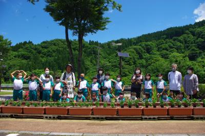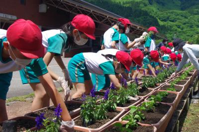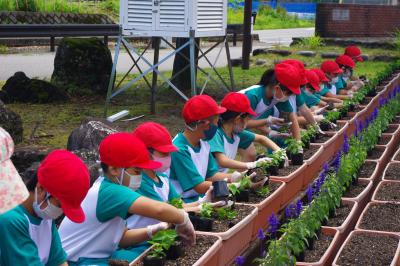 児童生徒が玄関前のプランターに花を植えました。