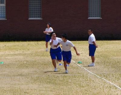 体育 リレーのバトン渡し練習をしています。