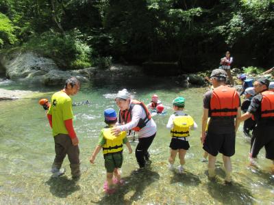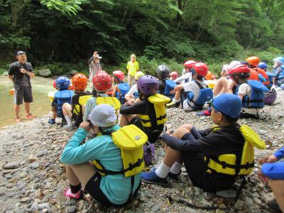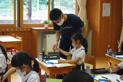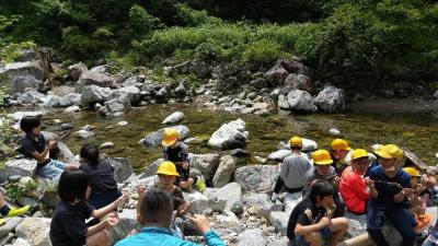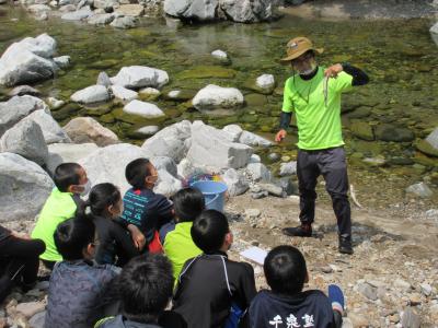 白山ろく少年自然の家で近隣の学校の5年生と一緒に学習活動を行っています。川に放った岩魚を手でつかみ、自分で捌き、焼いて食べています。