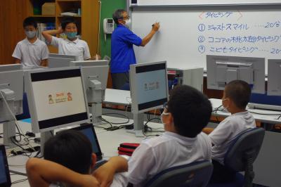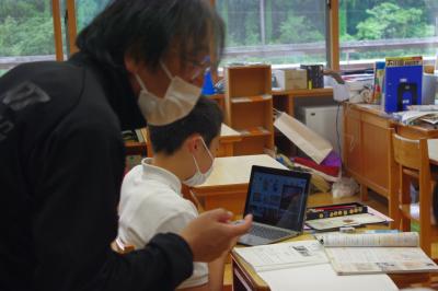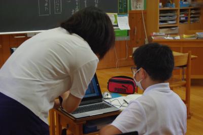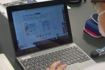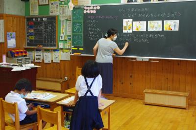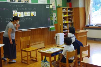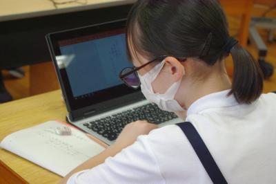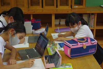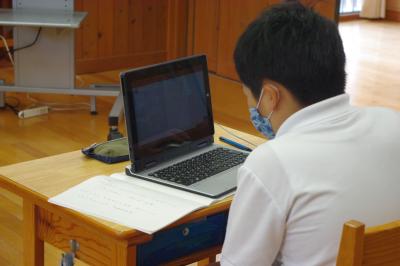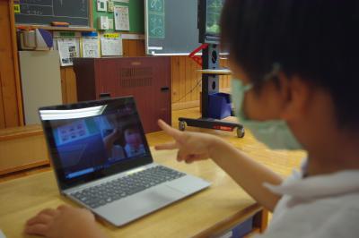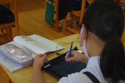 GIGA端末でオンライン会議の練習をしたり、国語では平仮名を書く練習をしています。