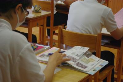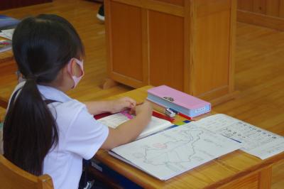 国語では新聞紙面の工夫を探し、社会では都道府県の名産を調べ、算数では小数の足し算を学んでいます。