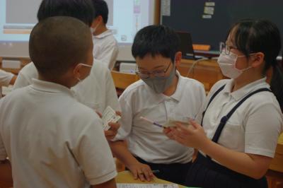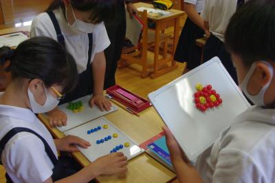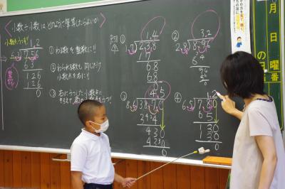 算数 小数が含まれる足し算や割り算について、計算の工夫を考えています。合理的に計算する見方や考え方について、児童が考えを伝え、様々な応用問題を解く際に、その考えをいかして計算しています。
