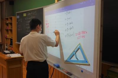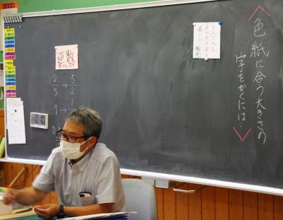 算数 余りのある割り算について、マグネットを使って考え方を交流させながら学んでいます。いしかわ師範塾の指導主事に授業を見ていただき、授業のアドバイスももらいます。