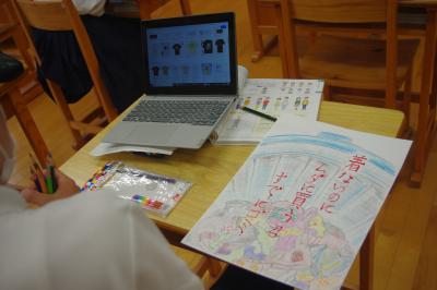 学級目標の掲示物を仕上げています