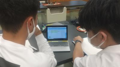 理科 植物の葉から出る酸素と二酸化炭素を計測しています。
